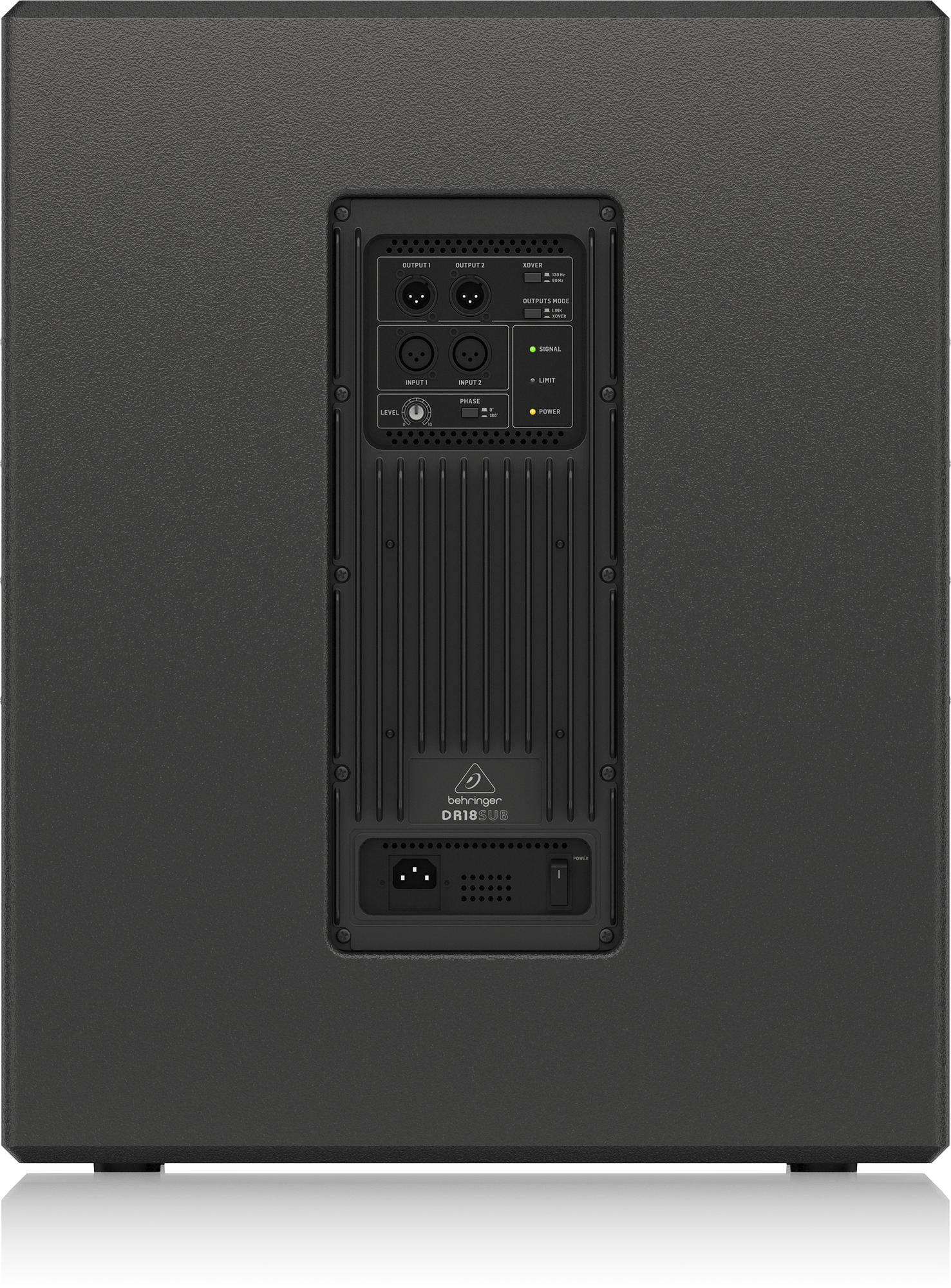 The DR18SUB features balanced XLR inputs and outputs, as well as optional output modes for multiple preferences. In Link Mode, the full range signals are passed thru to the full range satellite speakers; in Xover Mode, only signals above the cutoff frequency are sent to the satellite speakers. The cutoff frequency is also changeable between 90 Hz and 120 Hz by switch control. A Level knob controls the input gain, and the Phase switch reverses the output phase to compensate for frequency cancellation between the subwoofer and satellite speakers. LEDs show operational status at a glance, including power, signal present and input overloads. Rounding out this stellar set of features is an RMS and Peak limiter, which provides the ultimate in protection for the LF driver.
