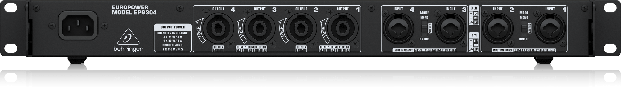 The front panel controls and indicators provide your system’s vital signs at a glance. After pressing the Power button, the Power LED lights to show the amp is ready for action. All channels feature positive-detent Gain controls with Signal LEDs that light when a signal is present, as well as Clip LEDs to indicate when the signal is distorted and you need to reduce the input signal. Just as elegant as the front, the rear panel is home to the balanced XLR and ¼ ” TRS Input connections, as well as the professional locking speaker Outputs. The same panel contains the switches that put the Channels 1/2 and 3/4 of the EPQ304 in Mono, Stereo (two channel mode) or mono Bridge mode.