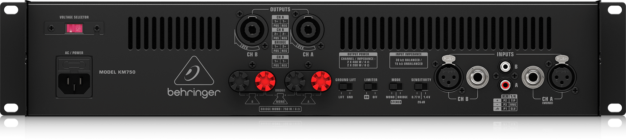 Just as elegant as the front, the rear panel is home to balanced XLR and ¼ ” TRS, plus unbalanced ¼ ” TS and RCA connections. Take your pick of professional locking speaker Outputs or touch-proof binding posts to securely connect speakers. The same panel contains the switches that put the KM750 in Mono, Stereo (two channel mode) or mono Bridge mode. Flick the Limiter On/Off switch to activate the built-in overload protection.