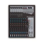 The master section of the mixer includes two effects loops, balanced XLR outputs, group and monitor outputs and a headphone jack. The VIBZ 12 also has RCA connectors for recording and playback devices and a digital Digital Effects Section with 100 presets.