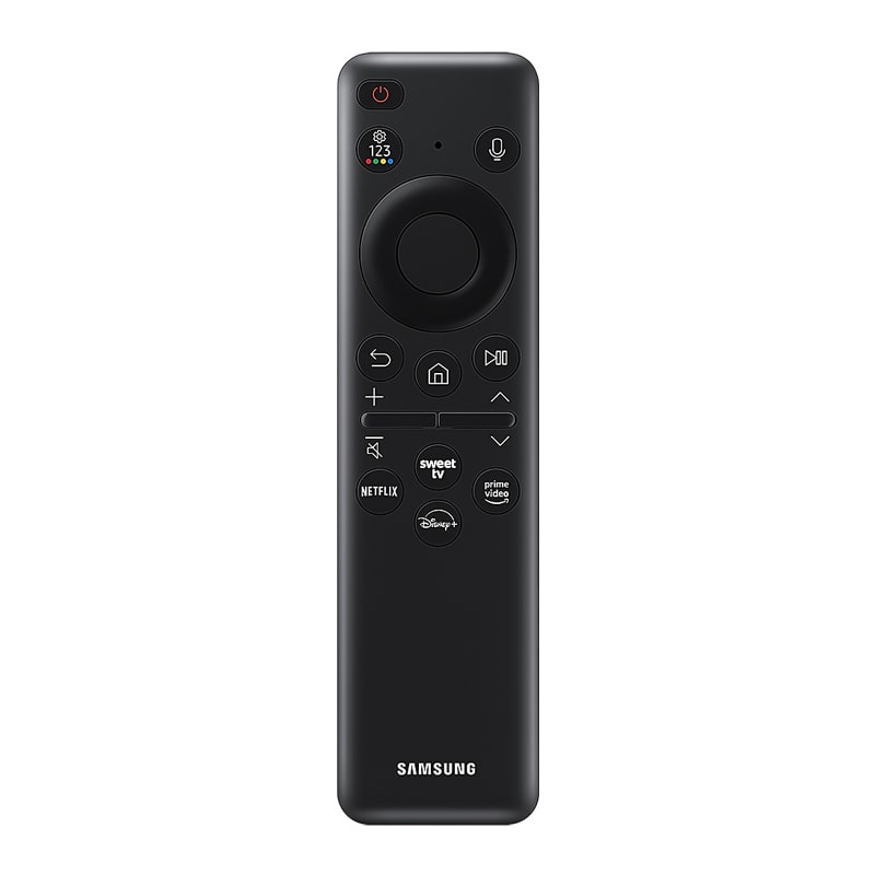 * To charge the remote with solar energy, set the TV remote down with the solar panel facing up. Place it in your living room while your lights are turned on, or you can place it near a window where it will soak in natural sunlight.* In case the remote’s battery is depleted, you can charge it using a USB-C cable. To check the remaining battery level of the remote control, refer to the TV Menu (Settings > General & Privacy > Power & Energy Saving > Available Remote Battery).* The design and button layout of the SolarCell remote may vary depending on the region.* SolarCell Remote in 2024 TV models contains a minimum of 24% recycled plastic (based on weight of total plastic)